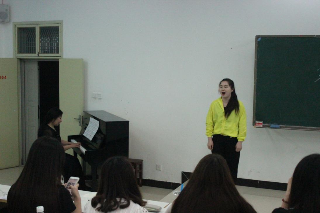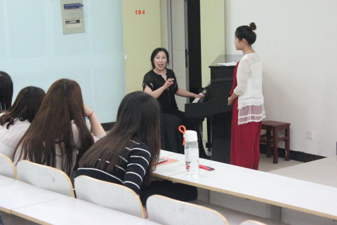 最后,张老师让同学们欣赏了两位大三学生带来的作品,演示了声乐教学的方式。张老师和学生合作弹唱的《玫瑰三愿》和《我亲爱的爸爸》,赢得了同学们热烈的掌声和阵阵欢呼声。